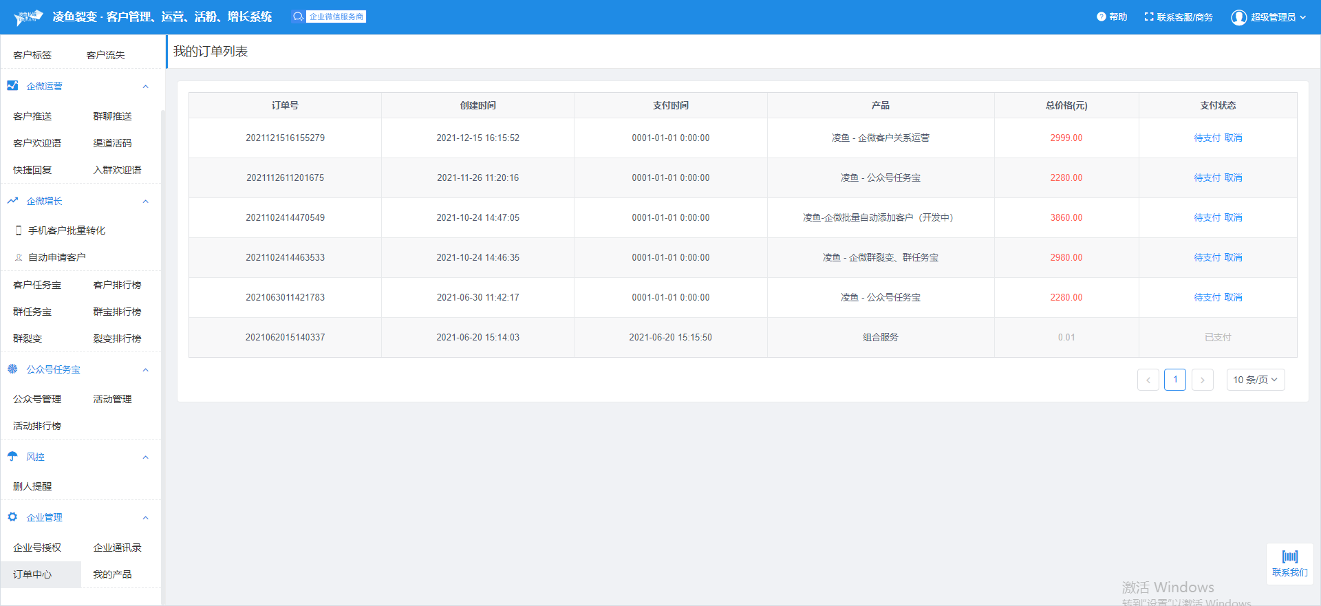 订单中心,可以查看您购买凌鱼私域所有产品的信息详情