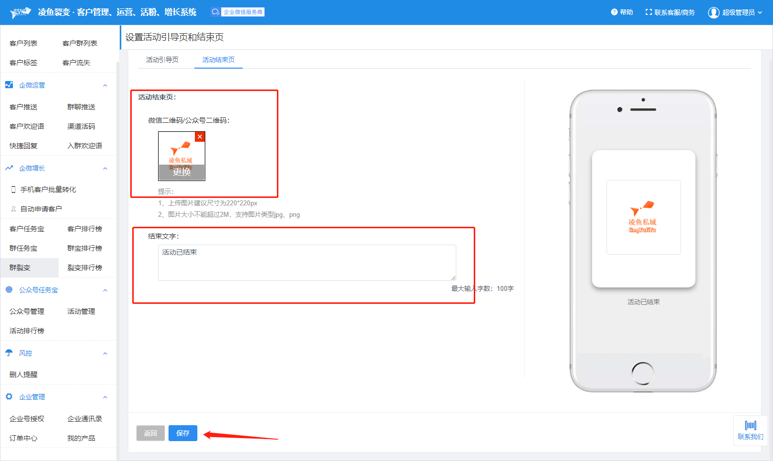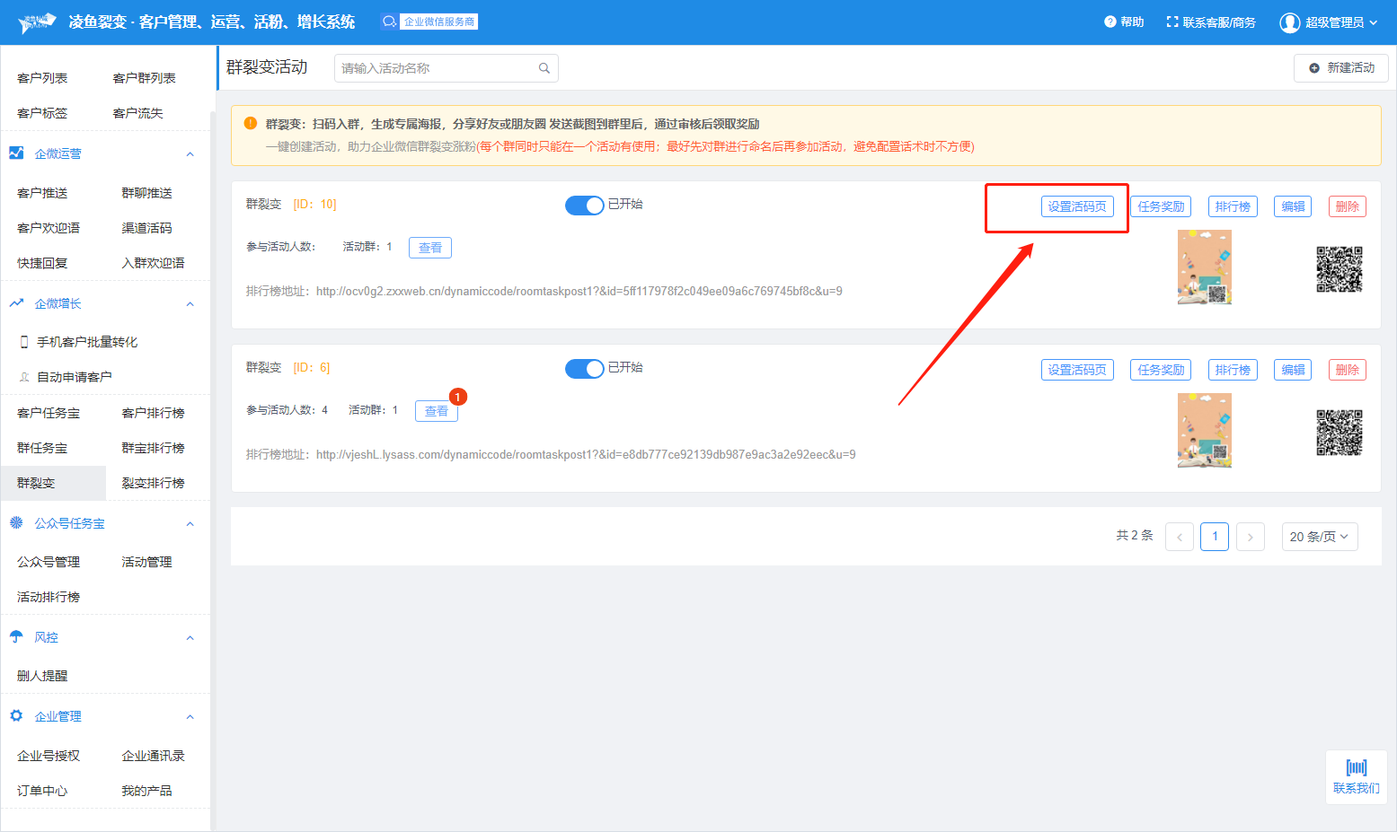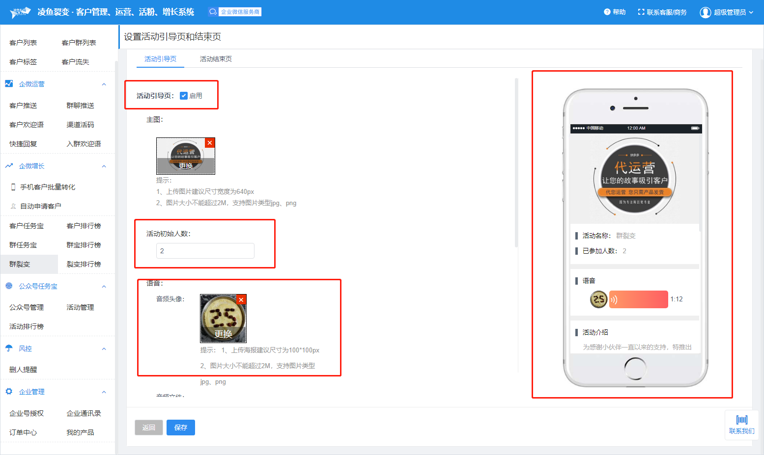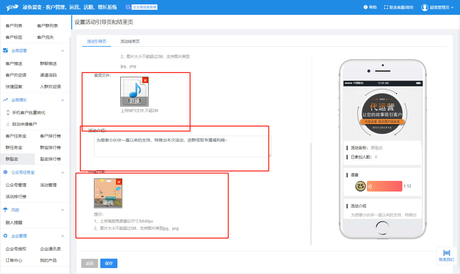 活动引导页可添加主图,音频头像、背景音频,活动介绍 和详情页面,让活动多样化,引导客户参加群任务宝活动。
