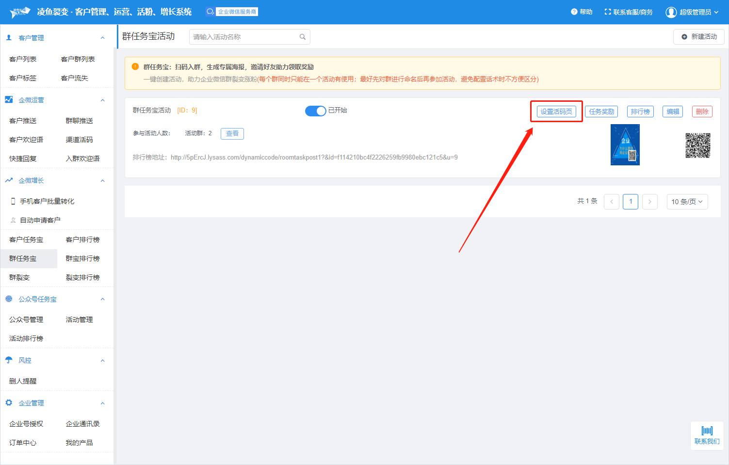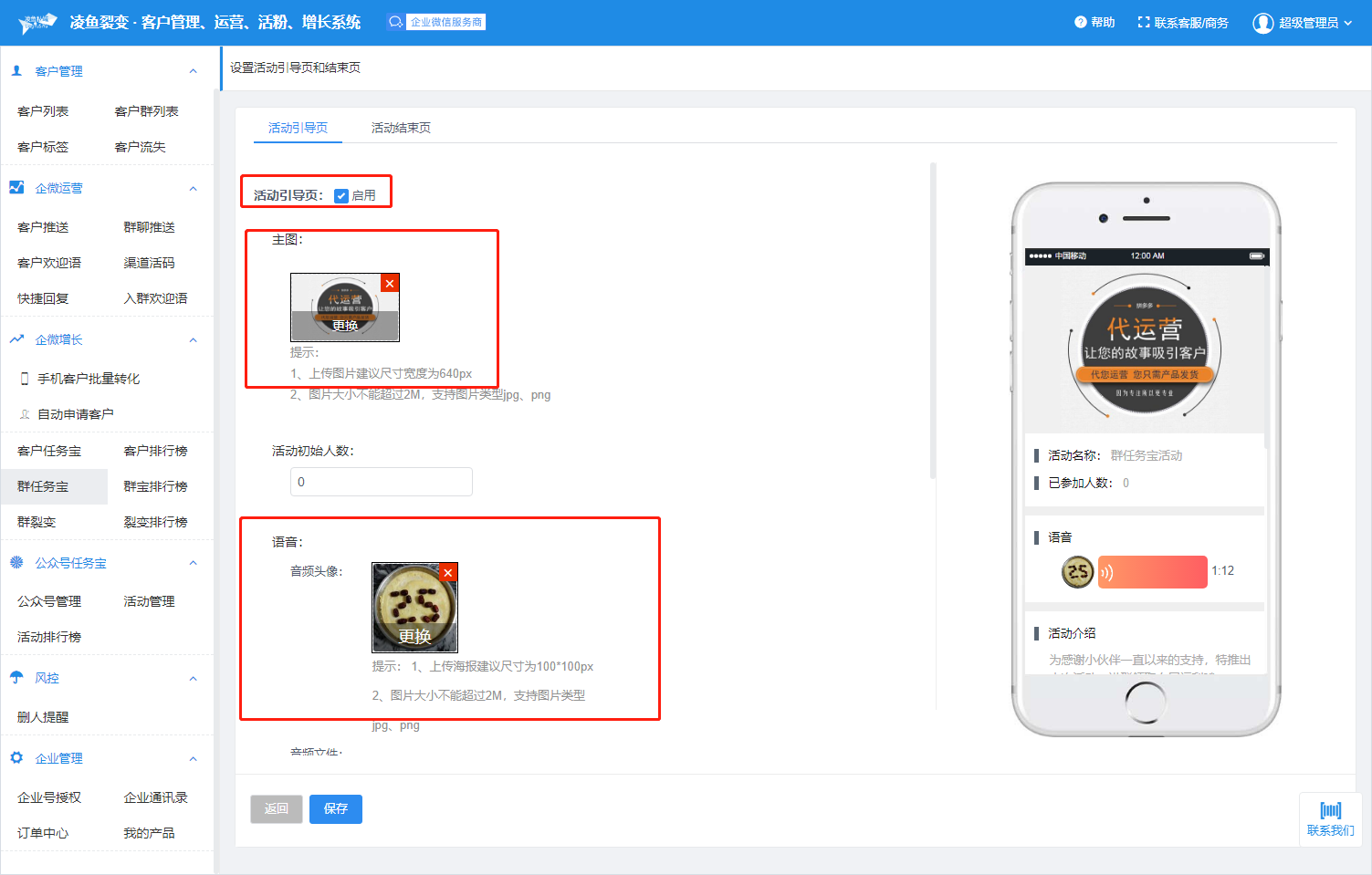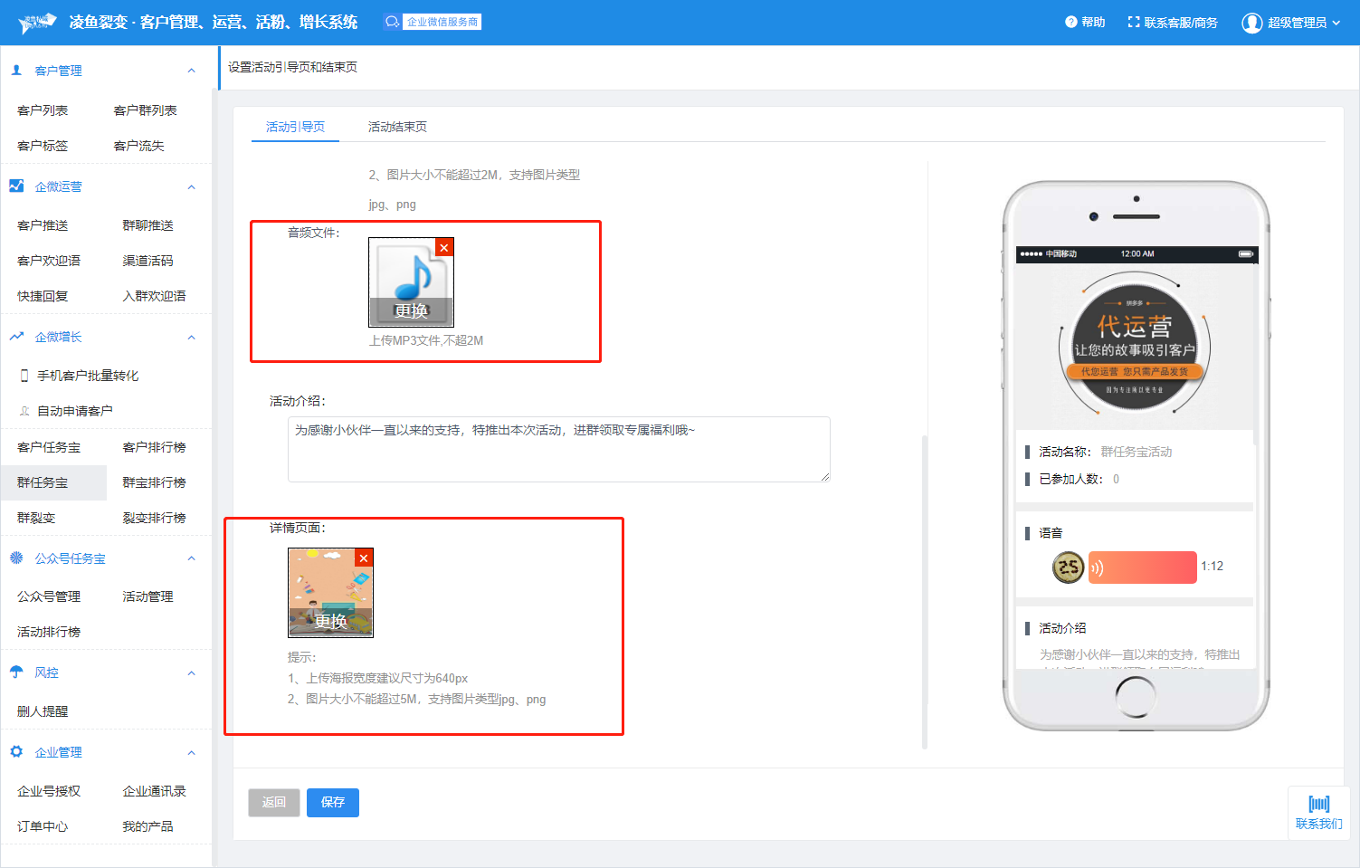 活动引导页可添加主图,音频头像、背景音频,活动介绍 和详情页面,引导客户参加群任务宝活动。
