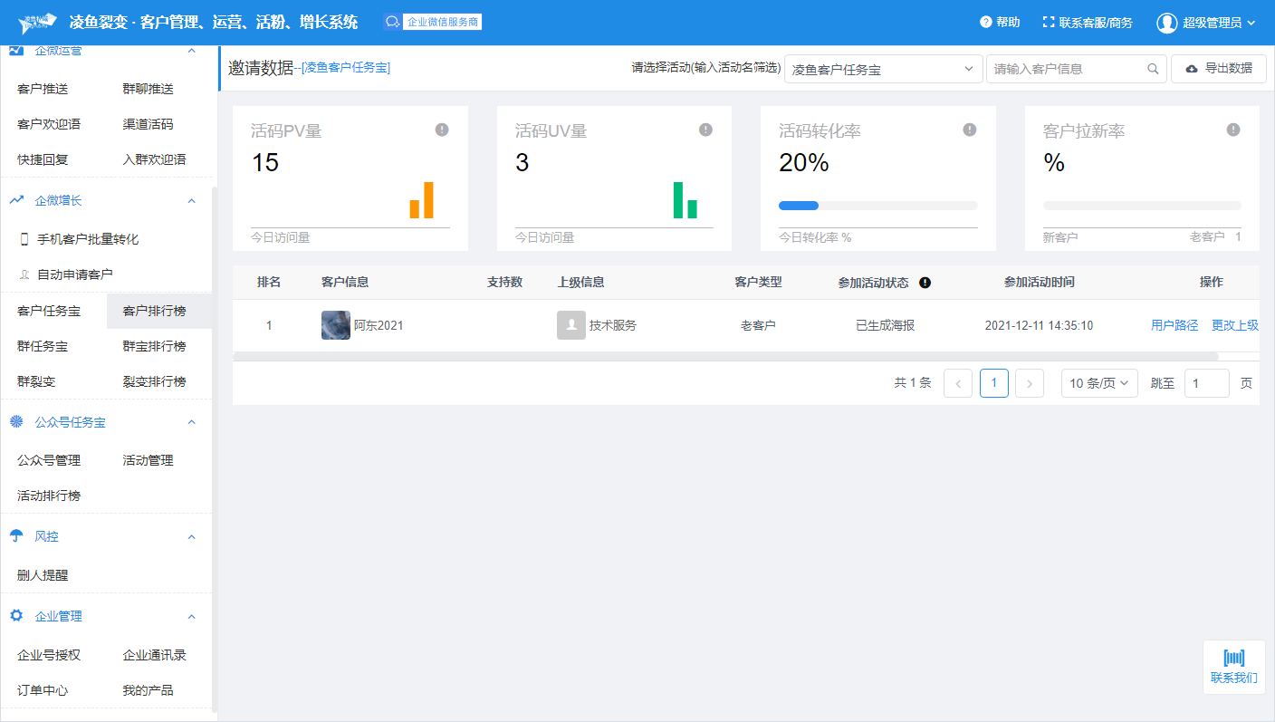 查看参加活动的新老用户助力排行,以及助力详情。以及统计活动的活码pv,uv,以及活动带来的新老客户数,拉新率相关数据。