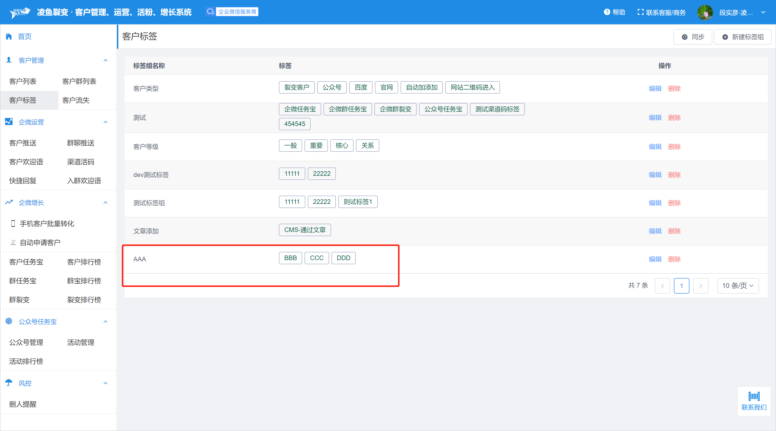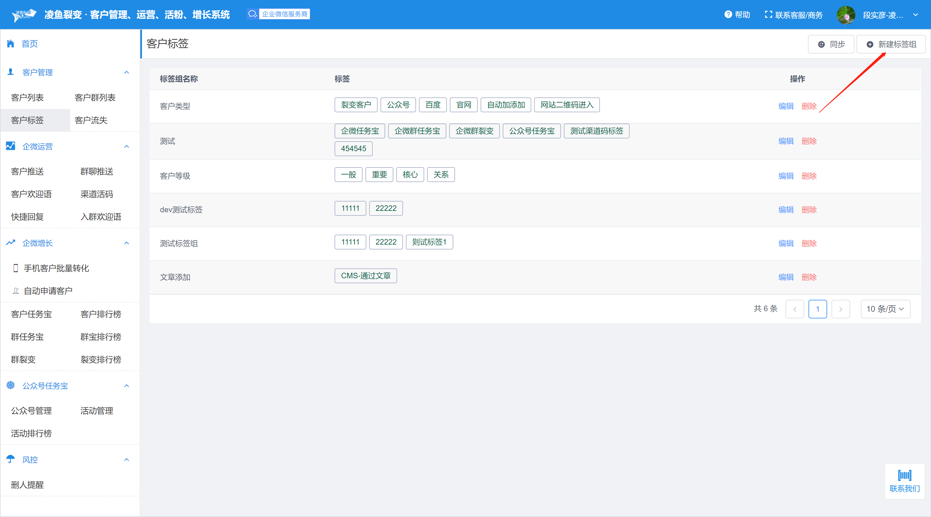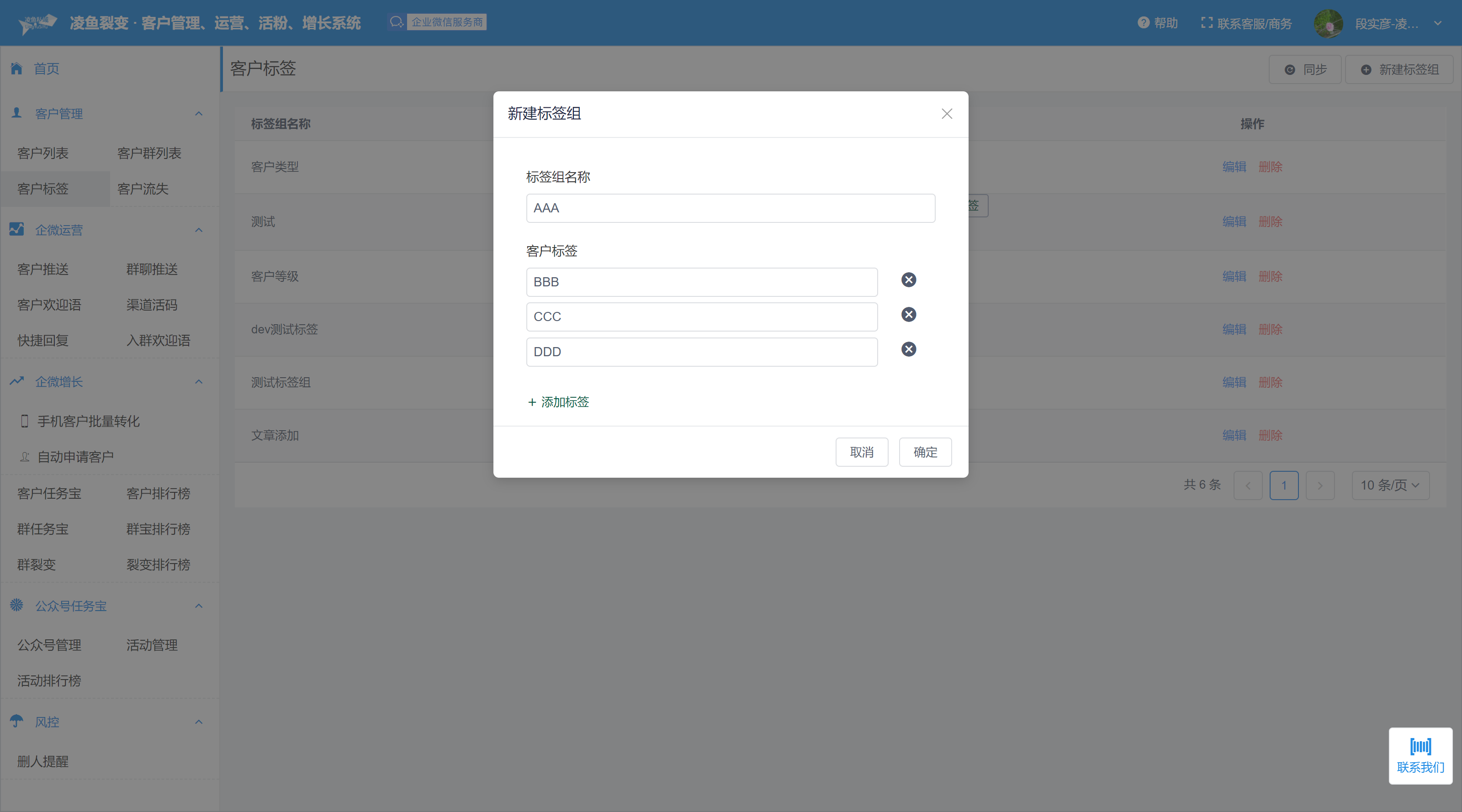 客户标签管理 1、进入客户标签页面,系统会自动同步企业标签 2、点击右上角新建标签组,就可以新建标签并同步到企业后台,方便给客户打标签 注意: ————- 1、标签组名称不能为空 2、标签组名不能重复 3、标签不能空 4、同一标签组下的标签名不能重复 3、点击确定完成创建