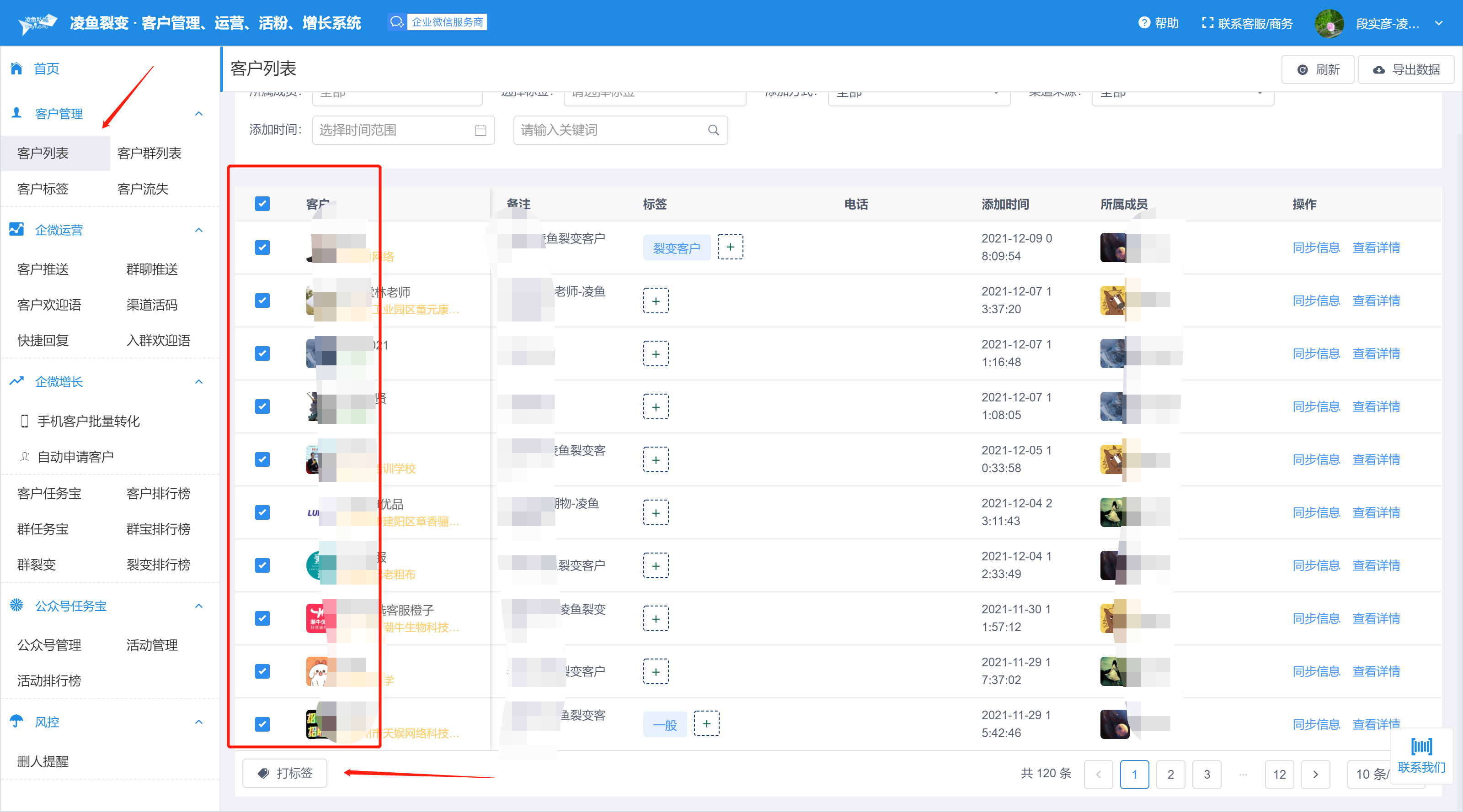 进入客户列表-批量选中客户后,点击“打标签”选择需要打的标签,选中的客户将会被自动打上该标签,进入查看详情页面也可以给客户进行打标签,点击“+”框也可以给客户打多个标签。
